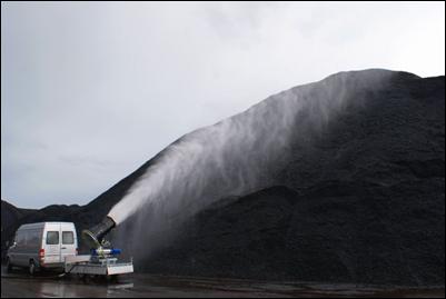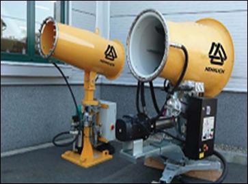 Водяная пушка – это оборудование для эффективного подавления пыли в местах возникновения сильного пыления на открытых складах и местах пересыпов ленточных конвейеров. Вода проходит под большим давлением через форсунки и распыляется в мелкий туман. Туман разносится сильным потоком воздуха с помощью мощного вентилятора, связывает частички пыли, делая их тяжелее, и они, под действием силы тяжести, опускаются вниз. Водяной туман, таким образом, возможно распылять на расстояние до 50 метров, что позволяет избавиться от негативного и чрезмерного пылеобразования на производственных площадках.